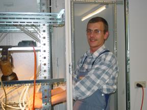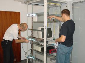 Steffen Poliscko hat während seines 14- tägigen Praktikums in unserem Büro ein völlig neues Netzwerk mit Serverschrank geplant, überwacht und bei der Installation selbst mit Hand angelegt. Hier bei der Nachtschicht, wo auch alle Rechner mit neuen Netzwerkarten versehen wurden, damit am nächsten Tag weitergearbeitet werden konnte.